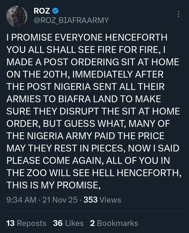 C‑ROZ wrote:“I promise everyone henceforth you all shall see fire for fire. I made a post ordering sit at home on the 20th. Immediately after the post, Nigeria sent all their armies to Biafra land to make sure they disrupt the sit at home order.