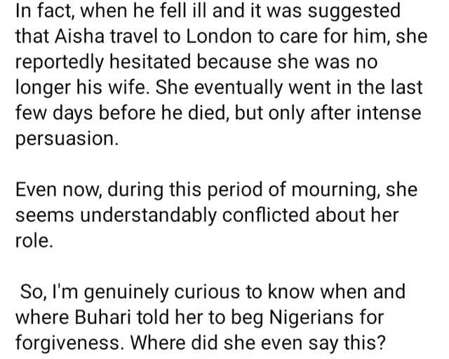 “So, I’m genuinely curious to know when and where Buhari told her to beg Nigerians for forgiveness. Where did she even say this?”