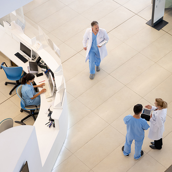 Group of doctors and nurses working at the hospital and walking around the entrance hall - healthcare and medicine concepts