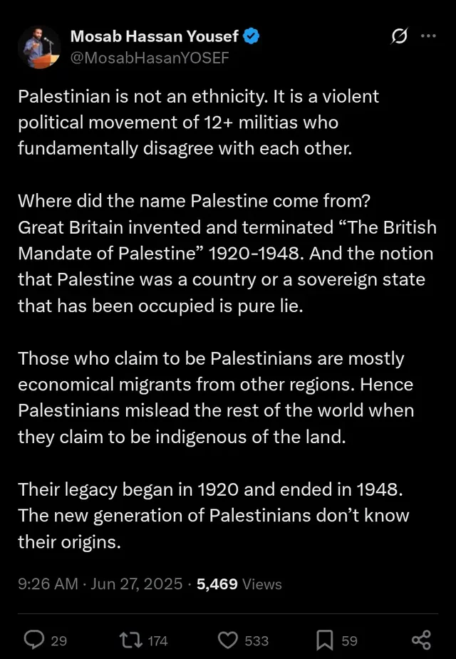 Yousef contended in his post that the name “Palestinian” refers to a “violent political movement” composed of more than a dozen militias that, in his words, “fundamentally disagree with each other” rather than an ethnic group. He further claimed that the name “Palestine” itself was a colonial invention of Great Britain during the British Mandate of Palestine, which lasted from 1920 to 1948, rather than an indigenous one.
