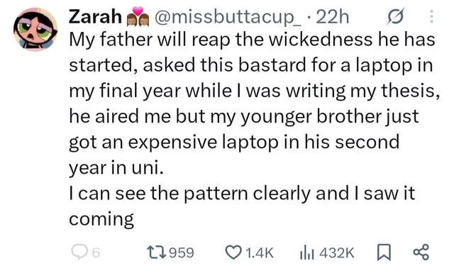 The lady tweeted: “My father will reap the wickedness he has started, asked this bastard for a laptop in my final year while I was writing my thesis, and he aired me but my younger brother just got an expensive laptop in his second year in uni. I can see the pattern clearly and I saw it coming.”