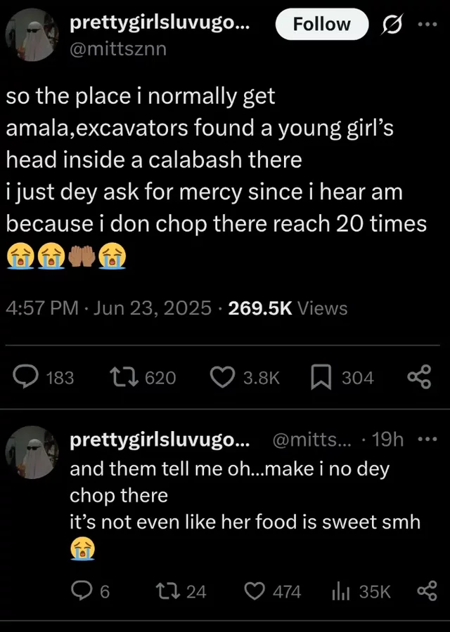 She wrote: “So the place I normally get amala, excavators found a young girl’s head inside a calabash there. I just dey ask for mercy since I hear am because I don chop there reach 20 times.”