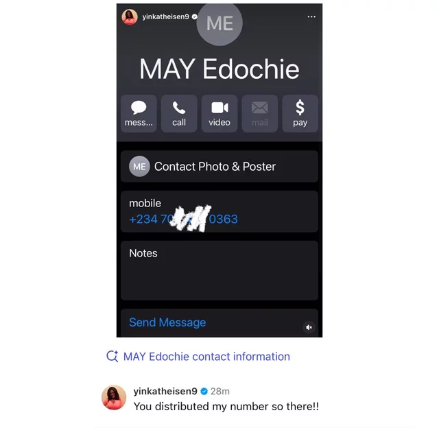 She called May out this afternoon by posting her contact information on her Instagram page. Yinka continued by saying that she would make their conversations public so that everyone could evaluate them.