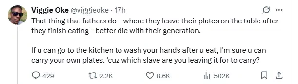 Since then, his comments have sparked heated discussion, with many social media users offering their opinions on what they see to be a more profound problem of entitlement, gender roles, and household duties in Nigerian households.