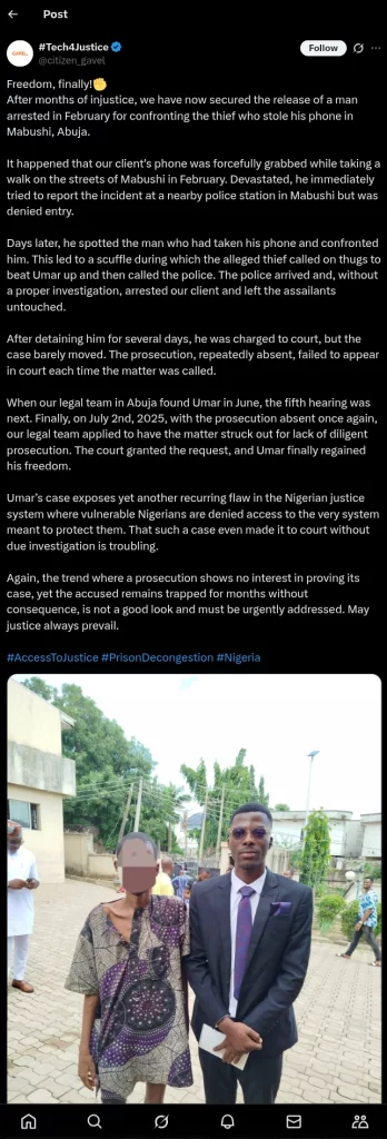 He was charged in court after being detained for a few days. However, the prosecution’s persistent absences caused delays in the legal procedure. On July 2, 2025, a legal team finally took up Umar’s case and went to court to ask that the matter be dismissed for lack of prosecution. Umar was released after the court’s agreement.