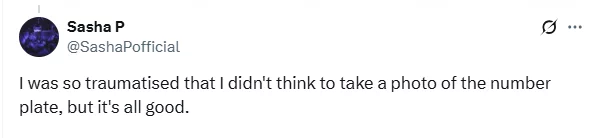 “I was so traumatised that I didn’t think to take a photo of the number plate, but it’s all good.”
