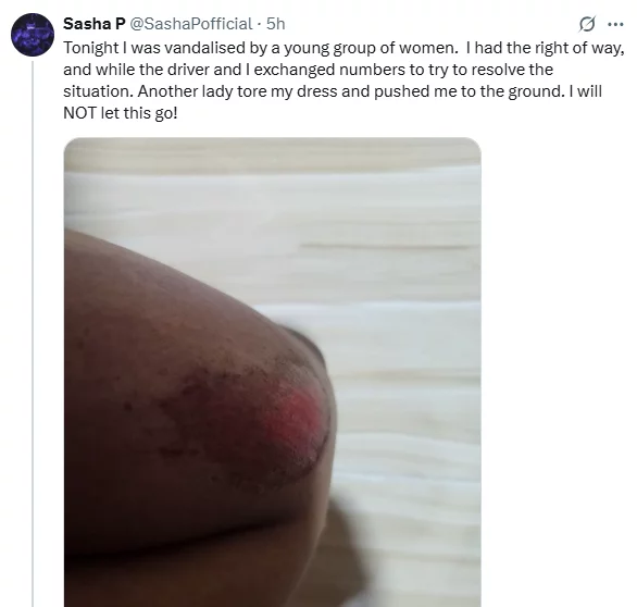 “Tonight I was vandalised by a young group of women. I had the right of way, and while the driver and I exchanged numbers to try to resolve the situation. Another lady tore my dress and pushed me to the ground. I will NOT let this go,” she wrote.