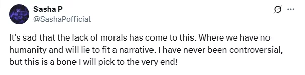 “It’s sad that the lack of morals has come to this. Where we have no humanity and will lie to fit a narrative. I have never been controversial, but this is a bone I will pick to the very end!