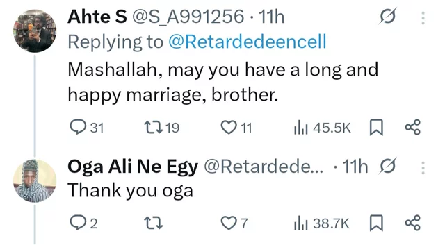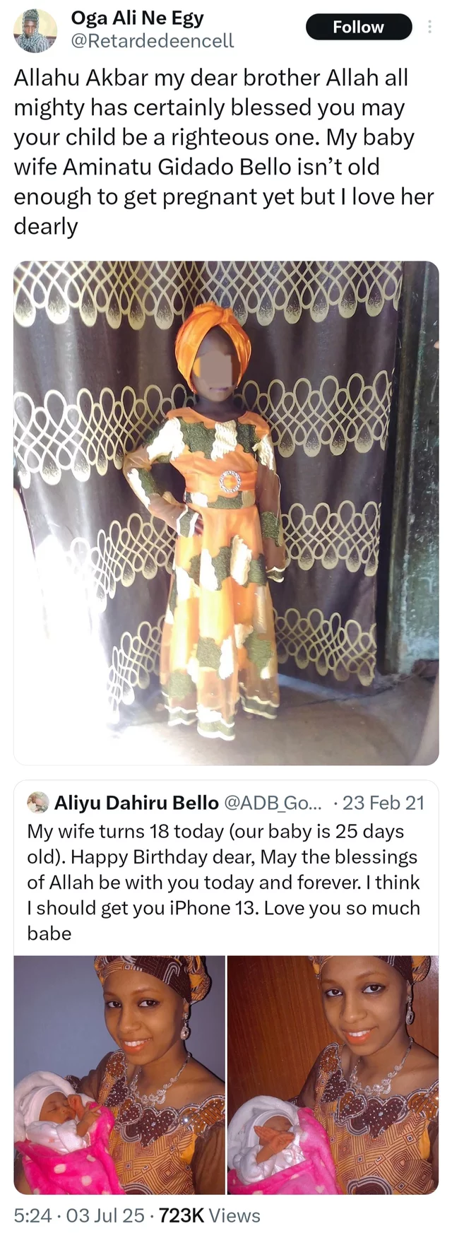 In the caption, the man wrote: “Allahu Akbar my dear brother Allah all mighty has certainly blessed you may your child be a righteous one. My baby wife Aminatu Gidado Bello isn’t old enough to get pregnant yet but I love her dearly.”