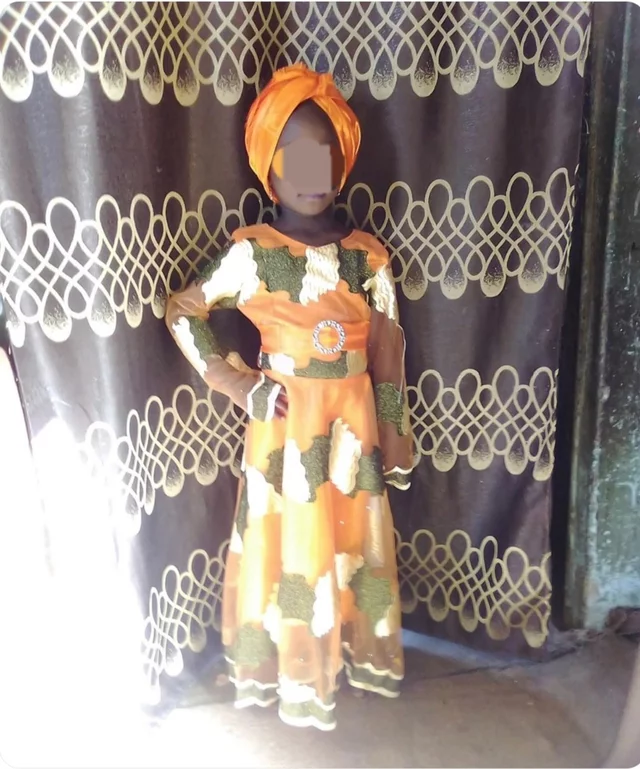 Posing with her head covered with a hijab, the girl appears to be under ten years old.