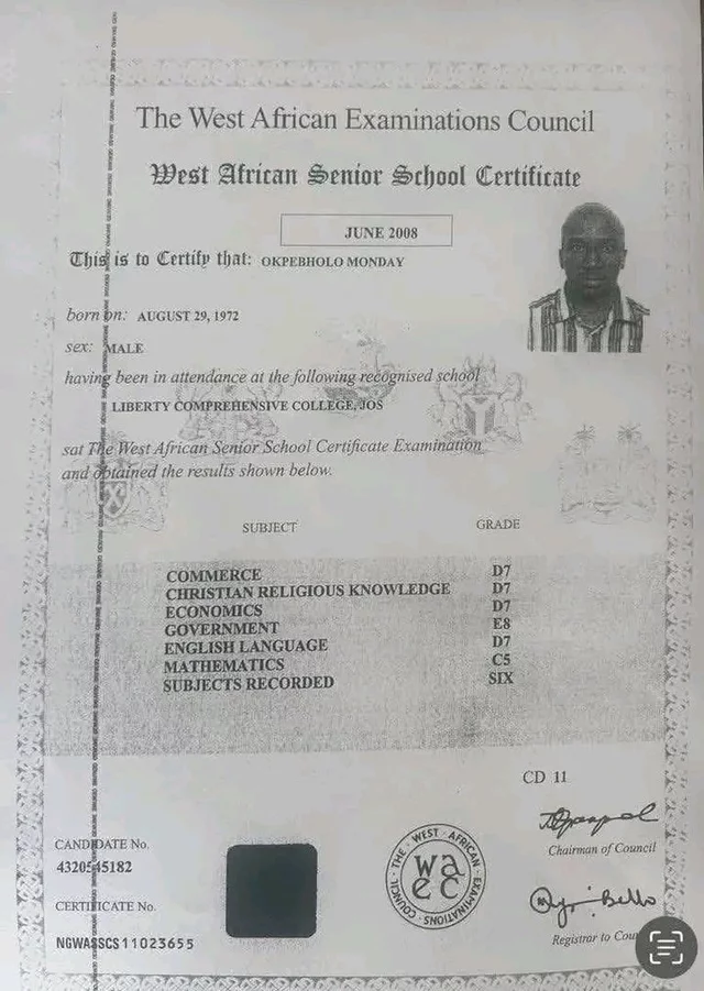 The governor’s best mark was a C5 in mathematics, according to the 2008 WAEC results, which demonstrate his dismal performance.