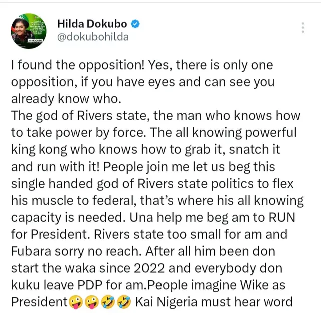 “The god of Rivers State, the man who knows how to take power by force….Rivers State too small for am and Fubara sorry no reach… Imagine Wike as President Kai Nigeria must hear word.” She wrote.