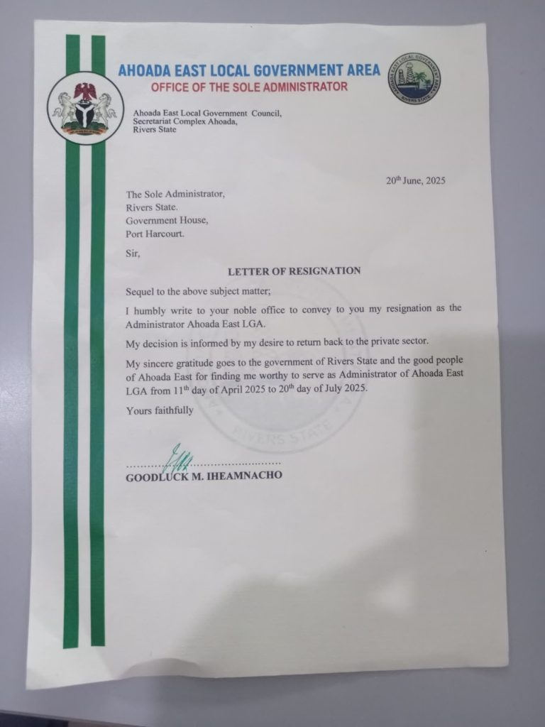 He wrote, “I humbly write to your noble office to convey to you my resignation as the Administrator, Ahoada East LGA… My sincere gratitude goes to the government of Rivers State and the good people of Ahoada East for finding me worthy to serve… from 11th day of April 2025 to 20th day of July 2025.”