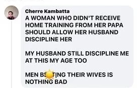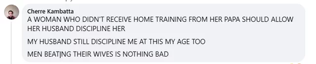 “A woman who didn’t receive home training from her papa should allow her husband to discipline her. My husband still disciplines me at this my age too. Men beating their wives is nothing bad,” she wrote.