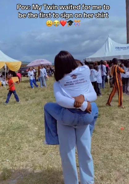 Her twin sister saw her from a distance and eagerly leaped on her in the joyous footage.
