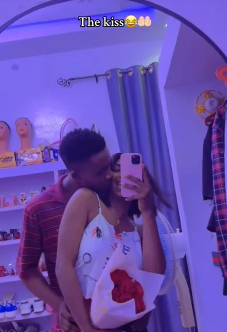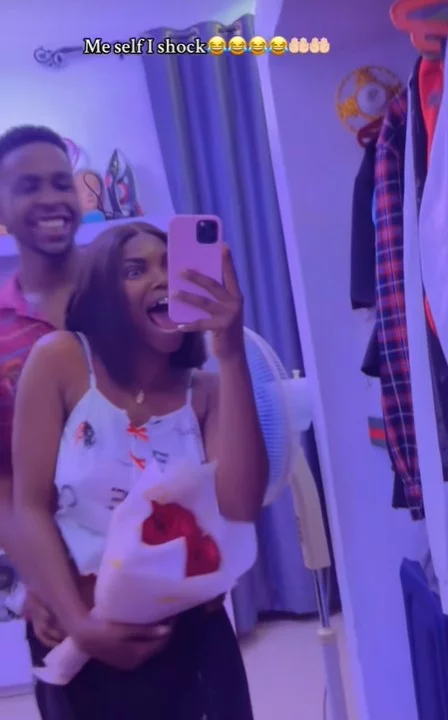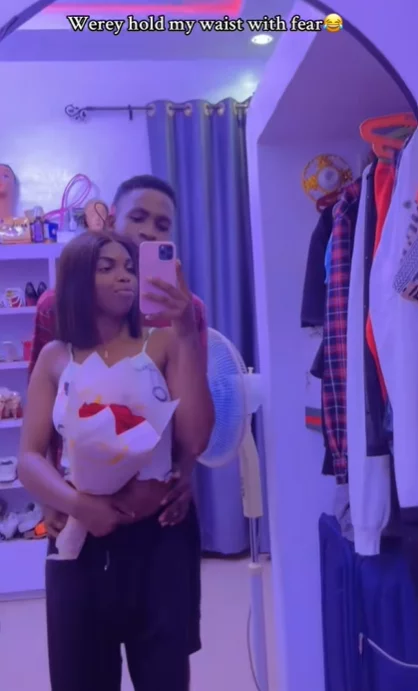 The video showed the woman @queeneth_1 and her younger brother posing as her boyfriend and holding her waist while they took a photo in front of the mirror. She saw her brother clutch her waist in fear.