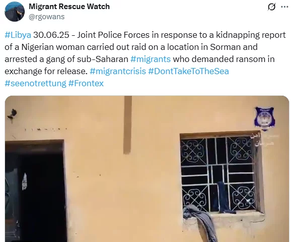 On Monday, June 30, 2025, Joint Police Forces conducted a raid on a place in Surman city, Tripolitania region of northwest Libya, in response to a report of the kidnapping of the Nigerian woman, and detained the gang, according to Migrant Rescue Watch.