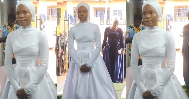 A bride wearing a modest wedding gown that completely covered her body, exposing only her face and hands, was seen coming down the aisle in an internet video. She held a Bible instead of the customary bouquet of flowers, demonstrating her strong religious beliefs.