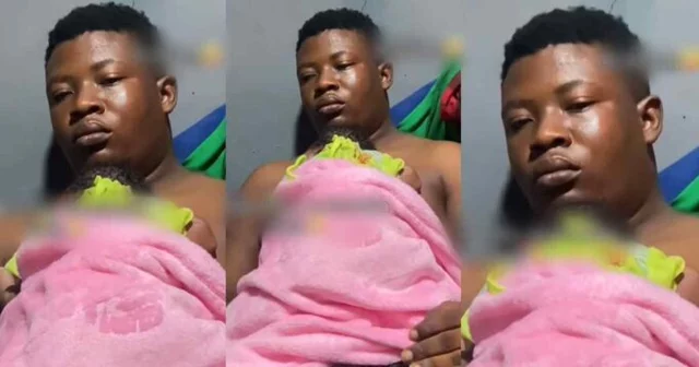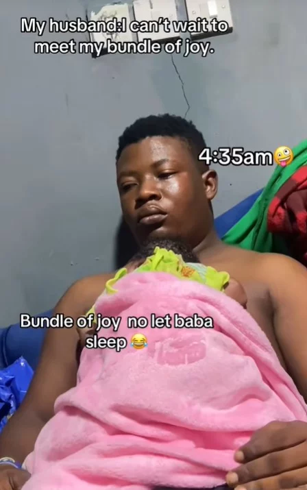 The viral video shows the new father trying to remain awake while holding their infant, who was awake in the early hours of the morning, with a fatigued expression on his face.
