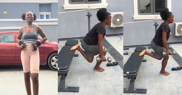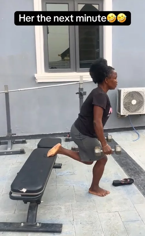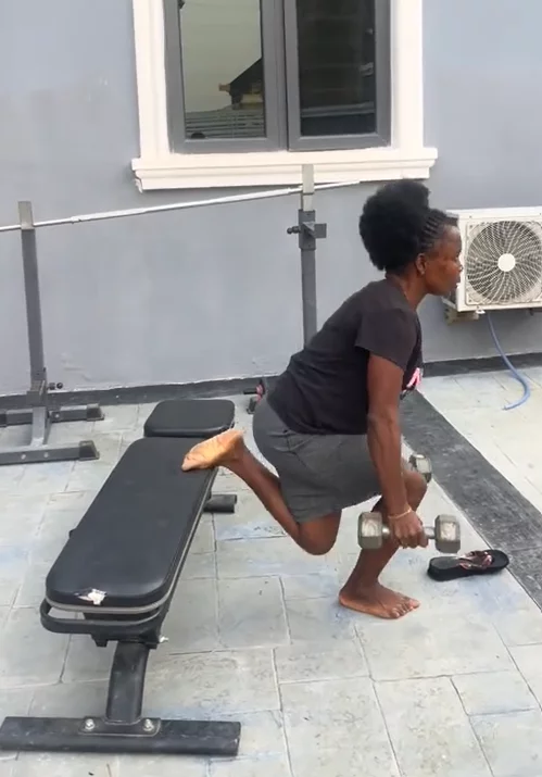 She records her nanny lifting weights and performing the Bulgarian split squats while wearing a resolute expression.