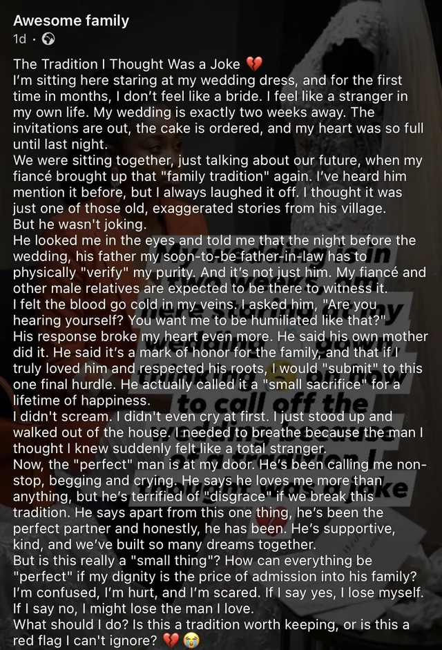 Awesome Family shared the story on Facebook, detailing her shock upon discovering a troubling “family tradition” that her fiancé expects her to participate in before marriage.