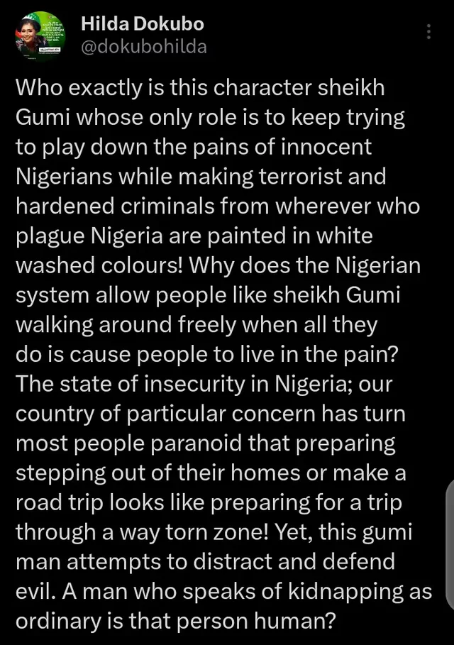 Nigerian politician, Hilda Dokubo has taken to her official X account on Tuesday, December 2, 2025 to inquire why it’s difficult for the Federal Government to arrest Islamic preacher, Sheikh Ahmad Gumi.