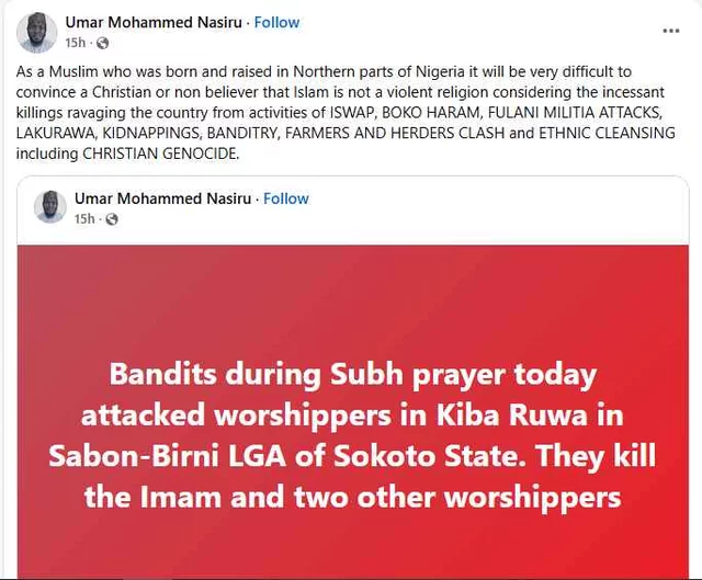 “As a Muslim who was born and raised in Northern parts of Nigeria it will be very difficult to convince a Christian or non believer that Islam is not a violent religion considering the incessant k!llings ravaging the country from activities of ISWAP, BOKO HARAM, FULANI MILITIA ATTACKS, LAKURAWA, KIDNAPPINGS, BANDITRY, FARMERS AND HERDERS CLASH and ETHNIC CLEANSING including CHRISTIAN GENOCIDE,” he wrote.