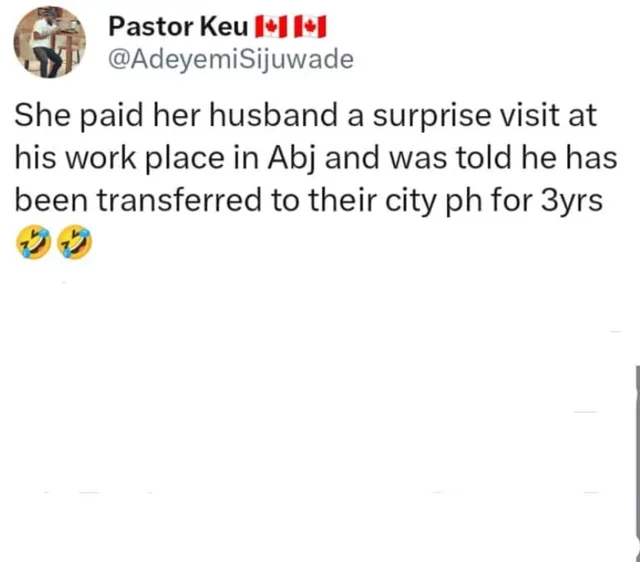 The post reads: “She went to surprise her husband at work in Abuja, only to be told he has been transferred to their city for 3 years. Shocked and confused, she didn’t know what to do next.”